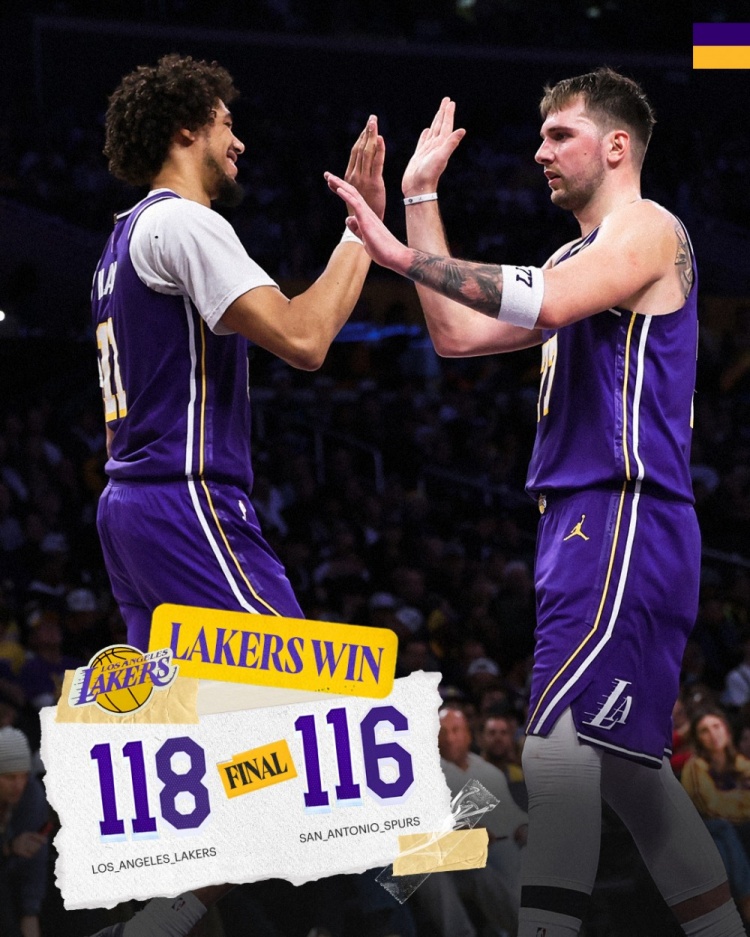 厥功至伟!湖人官方晒赢球海报 东契奇与海斯击掌画面登上封面