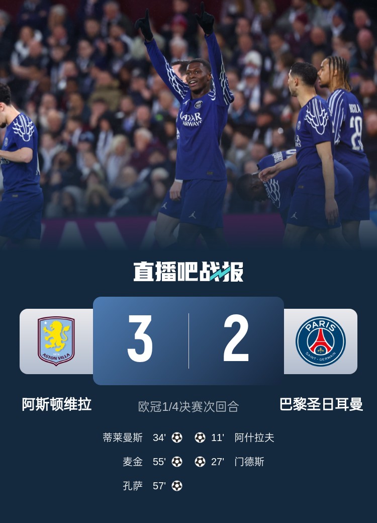 欧冠1/4决赛次回合,巴黎客场2-3维拉,总比分5-4惊险晋级4强。上半场,阿什拉夫破门,努诺-门德斯再下一城,蒂莱曼斯扳回一球;下半场,麦金远射,拉什福德边路强行爆破,助攻孔萨破门,阿森西奥错失扳平良机,多纳鲁马多次关键神扑。