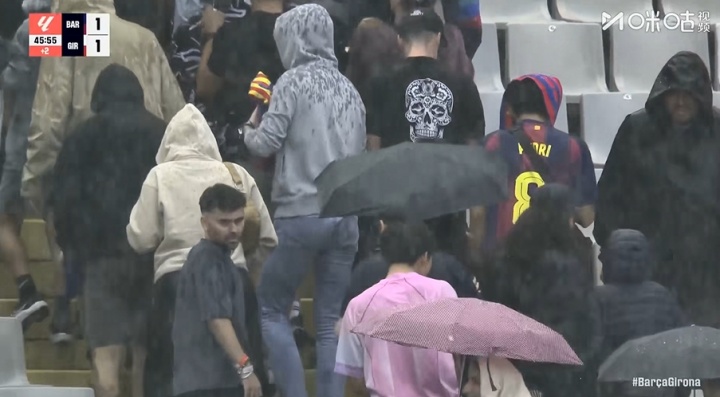 巴萨vs赫罗纳上半场补时阶段现场突降大雨,观众们纷纷离场避雨