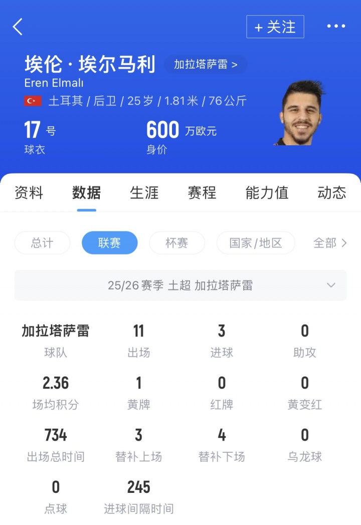 埃尔马利现年25岁,司职左后卫,身价600万欧,已代表土耳其国家队出场过20次。在9月、10月的国际比赛日期间,土耳其4场比赛中他三次首发出战。