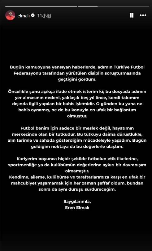 埃尔马利回应表示:“今天我注意到媒体报道中提及我的名字。首先我想明确声明:我的名字出现在该调查文件中,是因为约5年前,曾参与过一次与我所属球队无关的博彩。自那时起,我未参与任何赌博,也从未与此类行为有任何关联。足球对我而言不仅是职业,更是我生命中的主要激情。我一直以诚信、汗水和在球场上的拼搏精神来践行这份热爱。如今我能取得的成就,正是基于这些价值观。在我的职业生涯中,从未有过任何违背足球伦理、体育精神或俱乐部价值的行为。无论过去还是未来,我将始终保持透明态度,绝不让自己、家人、俱乐部和球迷蒙受丝毫耻辱。