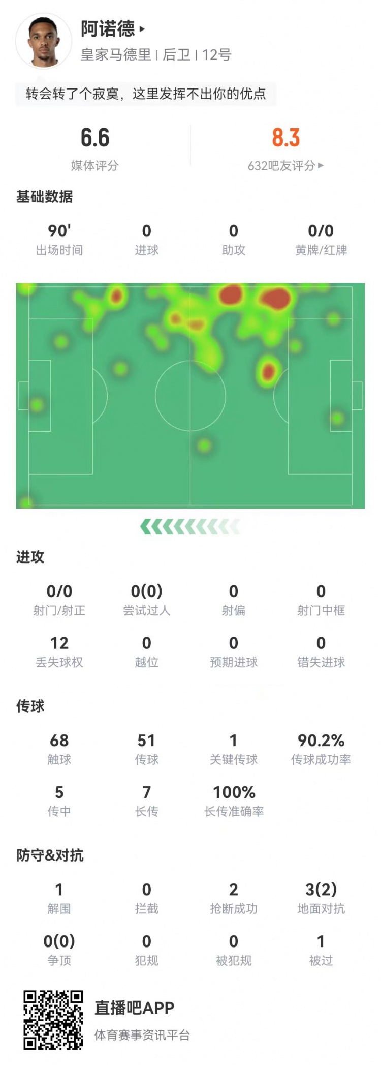 2025-11-27 08:03:10阿诺德本场1关键传球+7长传全成功 2抢断+12丢失球权 获评6.6分