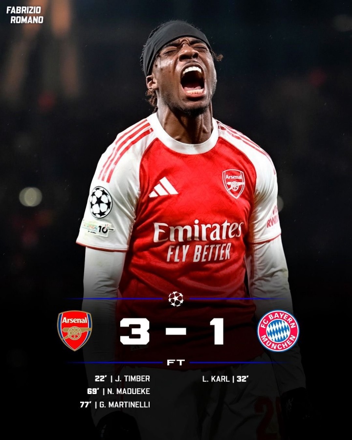 欧冠联赛阶段第5轮,阿森纳3-1战胜拜仁慕尼黑,马杜埃凯首球,诺伊尔送礼。