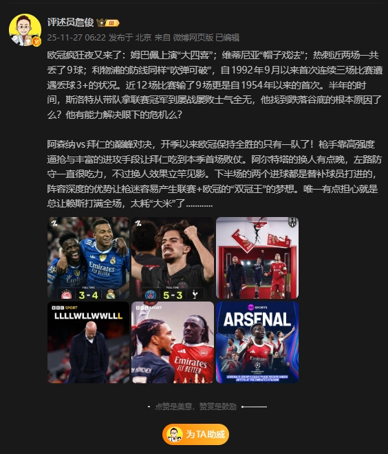 11月27日讯 欧冠第5轮比赛战罢,阿森纳5战全胜排名榜首,利物浦惨败埃因霍温,评述员詹俊先生在社媒做出点评。