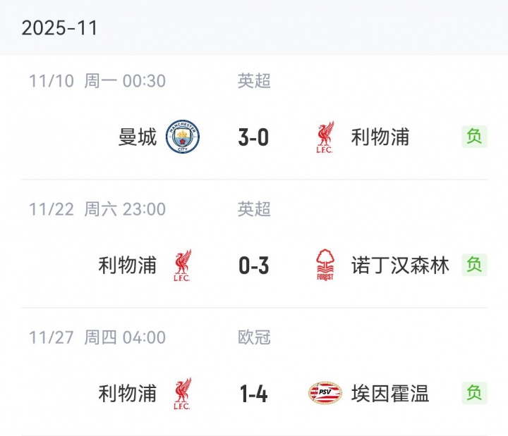 在这三场比赛中,利物浦均净丢3球(0-3曼城、0-3森林、1-4埃因霍温),共丢10球。