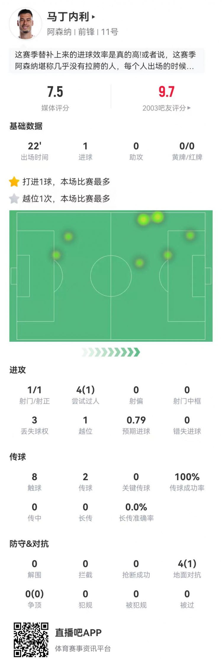 替补奇兵!马丁内利本场1射进1球 1越位+4过人1成功 获评7.5分