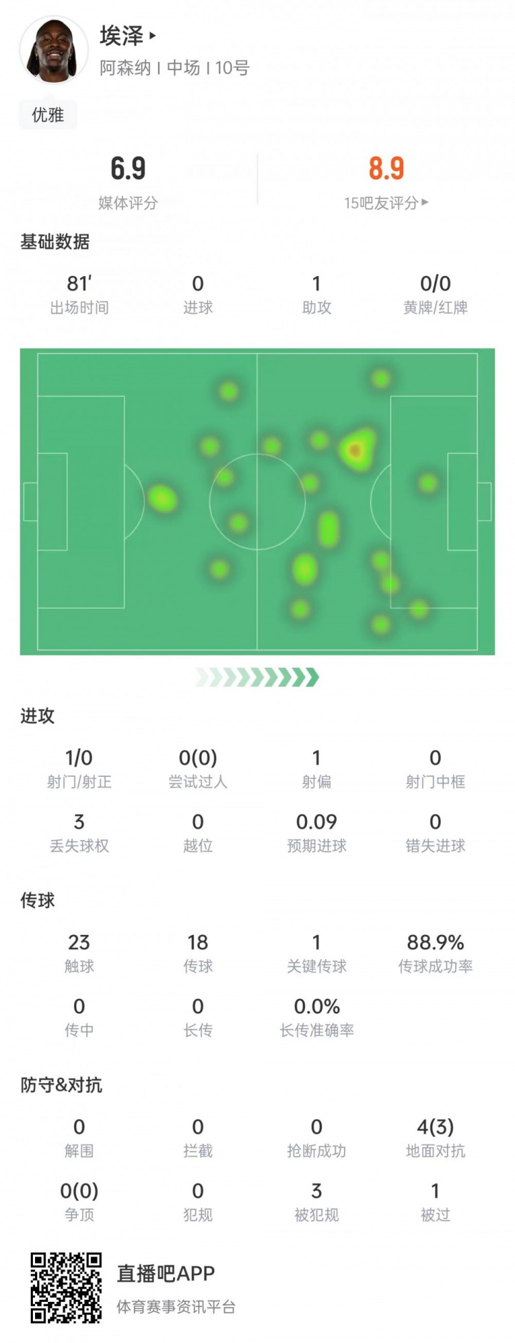 2025-11-27 08:07:51埃泽本场数据:送出助攻,4次对抗3次成功,获评6.9分