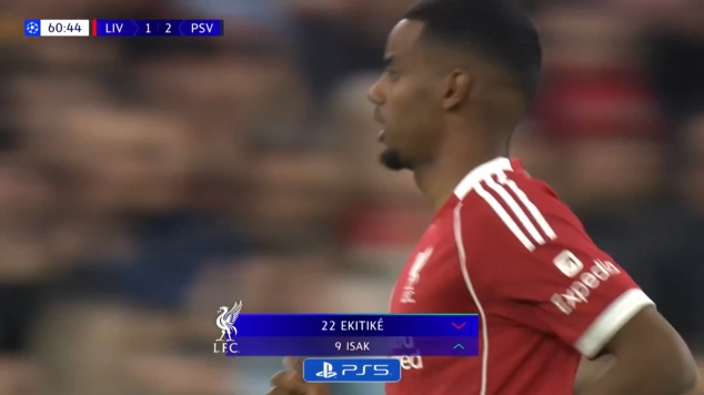 11月27日讯 欧冠联赛阶段第5轮利物浦vs埃因霍温,第61分钟,埃基蒂克因受伤无法坚持比赛,利物浦替换上伊萨克。